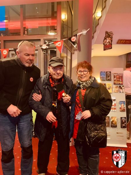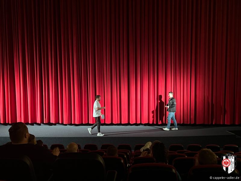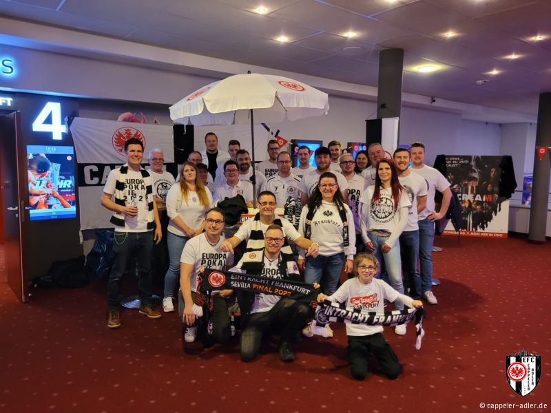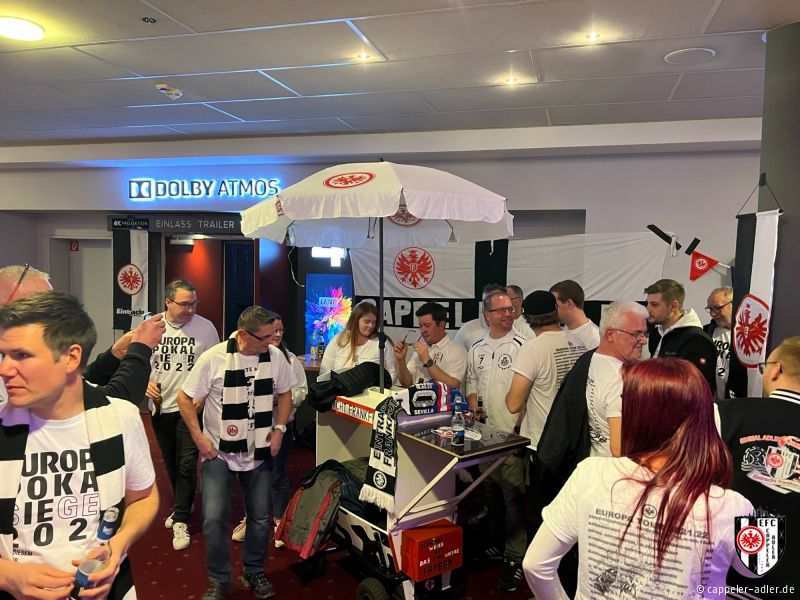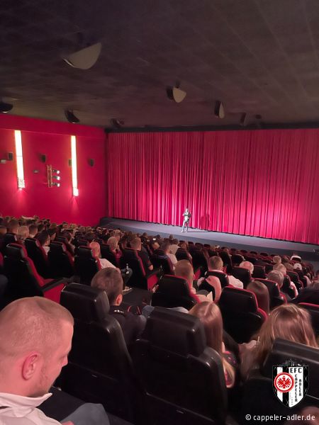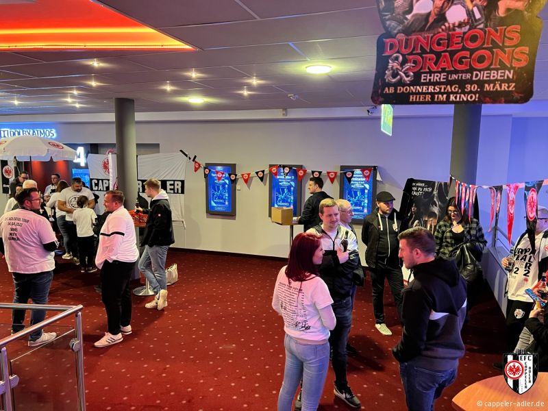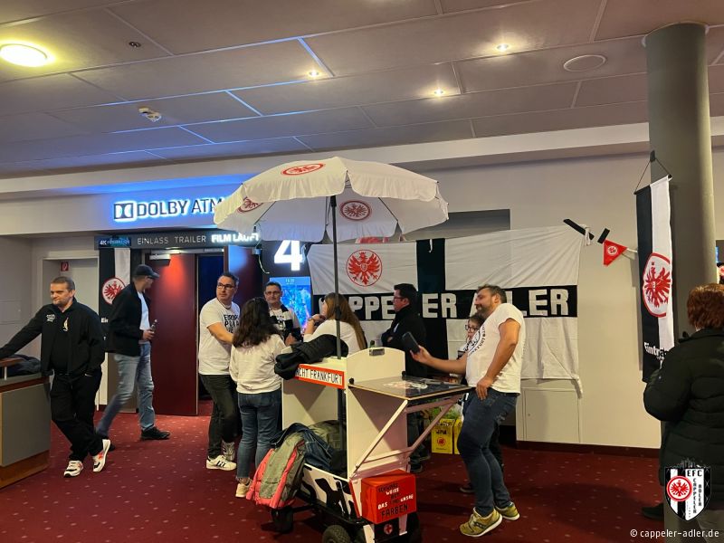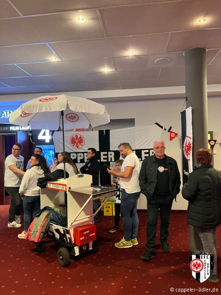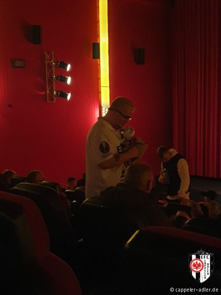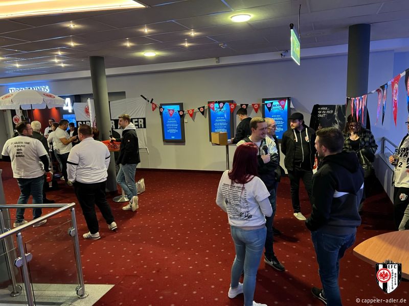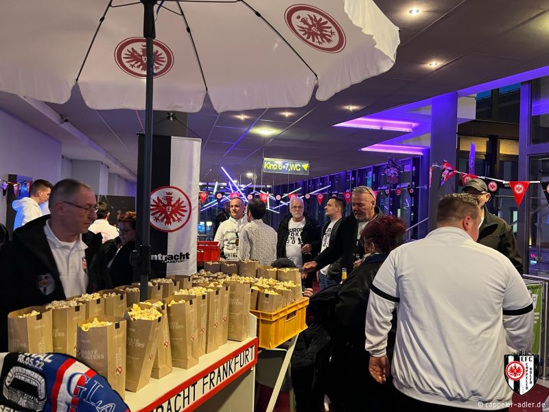 Gestern Abend war es soweit und die Cappeler Adler durften den Abend rund um den neuen Eintracht Film im Cineplex in Marburg mitgestalten. Es wurde alles im Eintracht-Stile geschmückt, Speis und Trank in Form von Popcorn und Äppler wurde ebenfalls angeboten. Durch unseren 2. Vorsitzenden, Daniel Müller, wurde der vollbesetzte Kinosaal stimmungsvoll eingeheizt und anschließend gemeinschaftlich ein emotionaler Film über den Europa-League Sieg angeschaut. Ein rundum gelungener Abend, den sogar unser Gründungsvater der Cappeler Adler, Helmut Wenzel, vor Ort miterleben konnte.